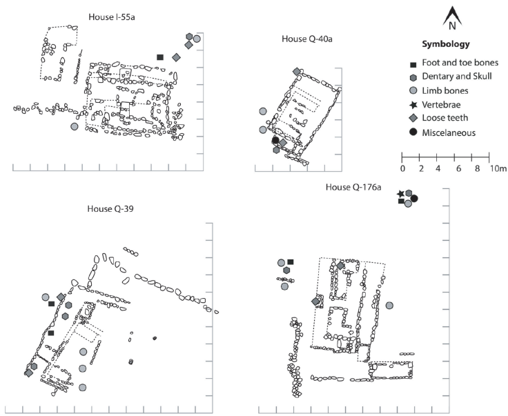 Figure 4 Distribution of skeletal elements in the structures I-55a, Q-40a, Q-39, and Q-176a