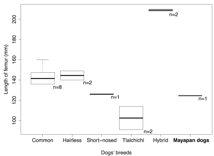 Osteometric analyses were conducted on the most complete elements or on those with observable attributes. Measurements were taken based on criteria established by Von Den Driesch (1976), including the maximum length and breadth of the proximal and distal ends of long bones and the length and breadth of first molars. Given the fragmentation of the sample, some measurements were impossible to document. Osteometric analyses of long bones and teeth were used for the comparison of Mayapán dogs to the documented metrics of dog breeds in Mesoamerica (Table 1), including the Mesoamerican common dog (Valadez 2000, 2003, Valadez et al. 2009), the hairless or xoloitzcuintli dog (Valadez 2009; Valadez et al. 2010), the short-nosed or Mayan dog (Valadez 2000), the tlalchichi (Valadez 2009; Valadez et al. 2011), and the wolf-dog hybrid (Valadez et al. 2001; Valadez et al. 2006).