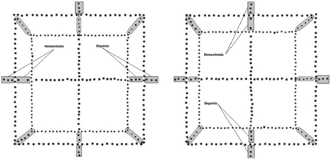 Para resolver las interrogantes surgidas, se procedió a realizar una separación de estos elementos, no referidos explícitamente por Sahagún. Un primer ordenamiento arrojó como resultado dos conjuntos, ordenados conforme a la lógica de la representación; por una parte, los cuadros concéntricos y, por la otra, las conglomeraciones restantes. El resultado, aunque alentador, no fue preciso, pues dio un conjunto de 259 y 44 puntos, 303 en total (figura 7). La primer cifra, no obstante, es cercana a la cuenta del Sol de Sahagún, razón por la cual se replantearon los conjuntos, de manera que pudieran considerarse para un caso 260 y para el otro 43 (figura 7). Si se consideran los conteos de 52 años, tendremos un registro de, al menos, 5 de estos ciclos (260), es decir, la base numérica del tonalpohualli; no se descarta, por lo tanto, su utilidad tanto para las cuentas de años, como también para las de días.