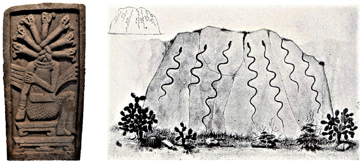 Figura 11 Representación de 7 serpientes en jugador de pelota decapitado de Aparicio, Veracruz; y en panel rocoso de La Quemada (Márquez 2021c).