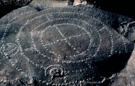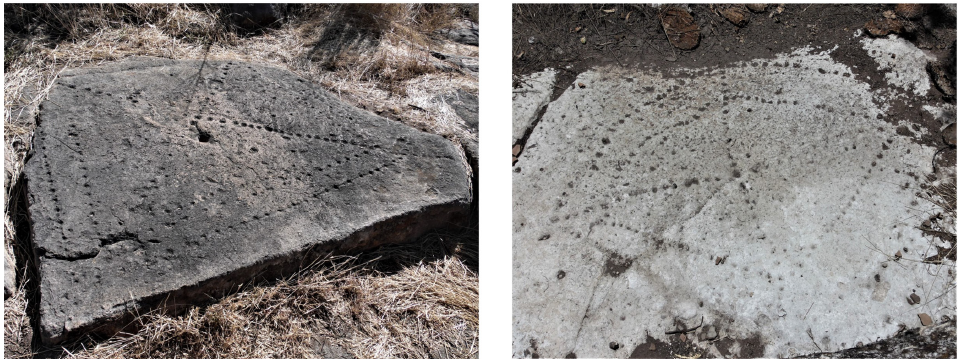 Las manifestaciones gráficas conocidas como cruz punteada consisten en petroglifos caracterizados por su forma de cruz (figura 3), elaborados a partir de perforaciones circulares a modo de puntos, en áreas que, en promedio, miden 90 cm de diámetro (Grazioso 1995: 381). Su diseño es variado y consiste en círculos o cuadrados concéntricos con una cruz central al interior prolongada hacia el exterior que divide estas formas en cuadrantes iguales.