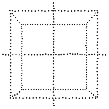 Antes de abordar el estudio concreto de la cruz punteada teotihuacana presentada en la figura 5, se consultó la tesis doctoral de Morante (1996), con la finalidad de precisar la fidelidad de la imagen tomada por Galindo y Klapp (2009), quienes no señalan la fuente de donde obtuvieron la representación, por lo que se asume su registro personal. Tentativamente, la imagen corresponde al marcador TEO 33, sobre el cual Morante (1996) no señala una cantidad precisa de puntos, suponiendo "pudo constar de 344" (Morante 1996: 143) suma obtenida por una suposición respecto de la representación "sus ejes norte y este se prolongan más allá del cuadrado exterior, como si se tratase de completar la cuenta de 344 días" (Morante 1996: 143), aunque en otra publicación asegura que tiene 346 puntos (Morante 1997: 426). Por si fuera poco, la imagen presentada en la tesis doctoral de Morante (1996: figura 5.14) no es de la mejor calidad y precisión. Se confió, de este modo, considerando la fuente, precisión y actualización del trabajo científico, que la imagen presentada por Galindo y Klapp (2009) corresponde a la del marcador.