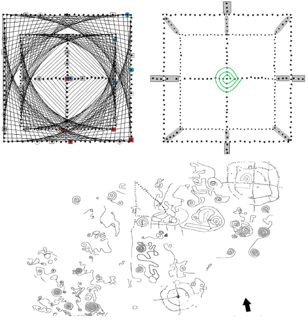 Figura 8 Conteo de 260 días en la cruz punteada de Teotihuacan, con líneas rectas y en espiral. Abajo, espirales y cruces punteadas asociadas procedentes de los Altos de Jalisco (Disponible en https://www.debate.com.mx/export/sites/debate/img/2016/07/17/hallazgo-11.jpg_815390619.jpg [Consulta: 02 de enero de 2020]).