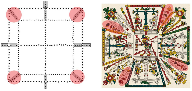 Figura 9 Disposición de los 20 caracteres de los días en 4 quintanas en la cruz punteada de Teotihuacan y en el Códice Fejérváry-Mayer (2005).