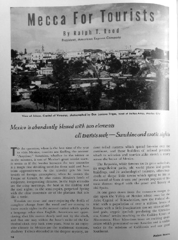 El último artículo por mencionar es el escrito por Ralph T. Reed (1946) titulado "La Meca para los turistas", donde el autor plasmó su opinión sobre por qué México se convirtió en uno de los países que más turistas atraía. Aunque la nota es breve, destaca que Reed retomó la narrativa de las publicaciones turísticas de principios del siglo XX, al ir más allá de una simple descripción física geográfica del sitio o exaltar sus puntos de interés, destacando aspectos históricos, culturales y sociales. Quizá la cita más clara al respecto es la que menciona "Los americanos aprecian que la vida se mueva lento y no cronometrada, y uno puede mediante el paro del tiempo del reloj de la catedral retroceder mil años" (Reed 1946: 16). Retomó la admiración del turista extranjero por las formas de vida sencillas o incluso rudimentarias y revalorizó la cotidianidad ajena a la del visitante, que invitaba no sólo a conocerla, sino a vivirla al tratarse de modos de vida más tranquilos en comparación con los estilos modernos.