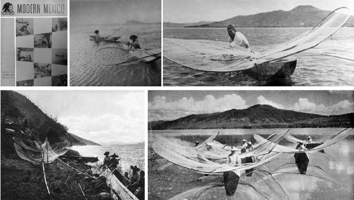 Figura 6 Collage de imágenes reiterativas de los pescadores de Pátzcuaro publicadas en revistas de la década de los cuarenta. Arriba izquierda, autor desconocido, ca. 1948 (Goldman 1948); arriba derecha, Harold Grossman, ca. 1947 (Lona 1947: 18); abajo izquierda, Hugo Brehme, 1925 (Garner 1943: 19); abajo derecha, Luis Márquez, ca. 1942 (Reynolds 1942: 22).