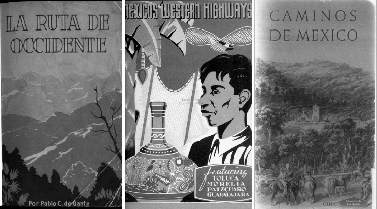 Figura 7 Portadas de las publicaciones de promoción turística por carretera. Izquierda, La ruta de Occidente (Gante 1939); centro, Mexico Western Highways (Pemex Travel Club 1940); derecha, Guía Goodrich Euzkadi (Asociación Mexicana Automovilística 1958).