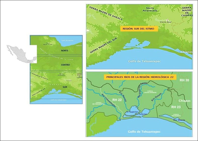 Figura 1 Regionalización del istmo de Tehuantepec; rasgos fisiográficos generales y principales ríos de la cuenca hidrológica 22 en la región sur (reelaborado de https://es.wikipedia.org/wiki/Istmo_de_Tehuantepec).