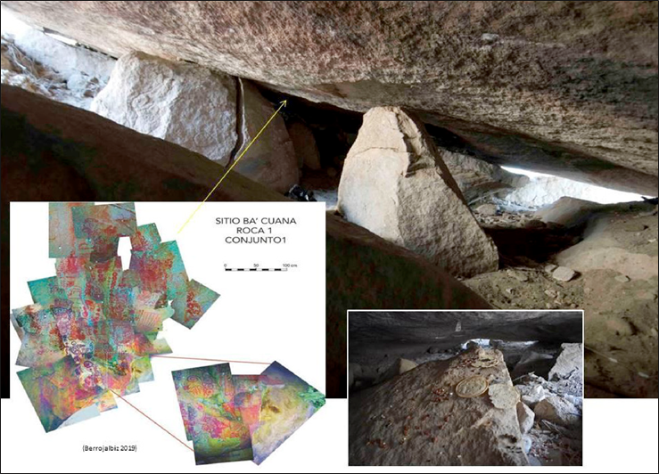 Figura 2 Interior del abrigo 1 en el sitio Ba’cuana; registro fotográfico del Conjunto 1 (Reelaborado de Berrojalbiz 2019); y disposición de ofrendas actuales a su interior (Imagen de F. Flores 2022).
