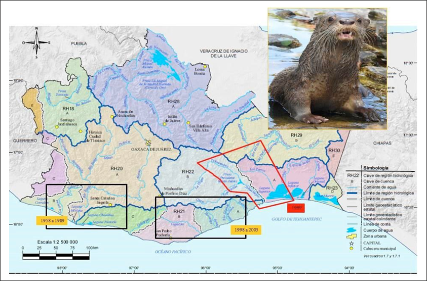 Estudios más recientes, realizados de 1998 a 2013, ubican las poblaciones de nutrias más importantes en San Pedro Huamelula, Santiago Xanica, Santiago Astata y San Miguel del Puerto, así como en la cuenca alta del río Copalita (RH 21, Costa de Oaxaca), y los cauces permanentes de los ríos Ayuta, Chacalapa y Zimatán. En este marco, destaca el hecho de que, desde finales de 1960, no existen registros sistemáticos de nutrias en los cuerpos de agua adscritos a la RH22 (Tehuantepec), específicamente en la cuenca baja de este río, luego de la obstrucción de su caudal original por la presa Benito Juárez (1962), así como en la del río Los Perros, afectada igualmente por las distintas obras hidráulicas emplazadas a lo largo de su cauce en los últimos 60 años (Figura 3).
