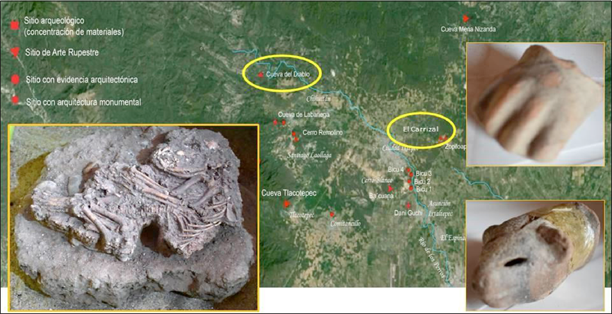 Figura 4 Ubicación de El Carrizal y la Cueva del Diablo en relación con otros sitios arqueológicos y rupestres en la cuenca del río Los Perros (reelaborado de Berrojalbiz 2006); osamenta de nutria hallada en El Carrizal, y soportes de vasijas en la Colección Arqueológica de la Casa de la Cultura de Ixhuatán (imágenes de F. Flores 2022).