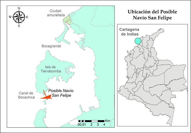 Figura 1 Ubicación del posible naufragio del navío San Felipe en la Bahía de Cartagena de Indias.