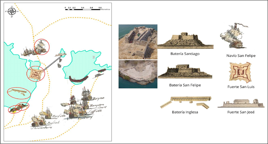 Figura 2 Componentes defensivos de la Corona española en el canal de Bocachica en Cartagena de Indias durante los días iniciales de la batalla en marzo de 1741.