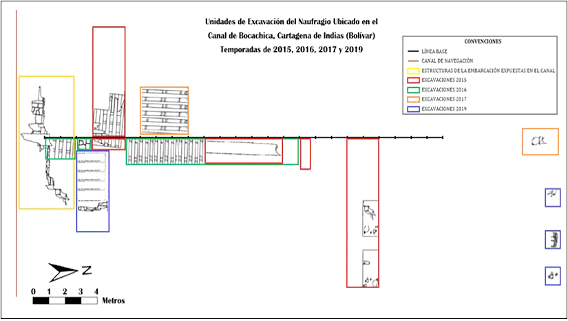 Asimismo, se han desarrollado intervenciones arqueológicas (Figura 3) que han consistido en trincheras o unidades de excavación de dimensiones variadas las cuales han permitido localizar diferentes evidencias vinculadas a los componentes estructurales (elementos del armazón principal y elementos constitutivos) y al equipamiento (objetos cotidianos de la vida a bordo y otro tipo de evidencias) del buque hundido a cinco metros de profundidad (Fundación Terrafirme, 2017; Aldana 2019; Del Cairo et al. 2020b). Las excavaciones han sido formuladas a partir de los elementos que quedaron expuestos en el talud generado por las labores de dragado, en donde se observan elementos estructurales longitudinales y transversales de la embarcación (Fundación Terrafirme, 2017; Aldana 2019).