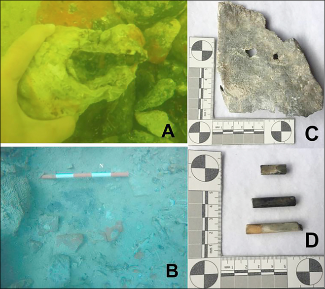 Cabe resaltar que el hallazgo de las placas de plomo son de particular relevancia no sólo por permitir adentrarse en las transformaciones técnicas que sufrieron los naufragios durante los siglos XVI-XVIII como respuesta a la interacción con los agentes naturales durante la navegación, sino que también son de gran relevancia pues muestran evidencias de afectaciones por altas temperaturas, lo cual podría corresponder a un incendio de la embarcación. Respecto a los elementos del equipamiento de la nave sólo se han hallado unos pocos, por ejemplo, fragmentos de líticos posiblemente correspondientes con piedras de chispa usadas para disparar las armas de fuego, balas de cañón, algunos elementos de botellas de vidrio de ámbar, aqua y azul cobalto, cañas de pipas de tabaco, porcelanas y algunos elementos de cerámica de origen local e importado (Figura 5).