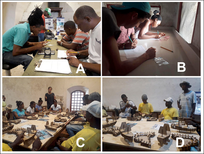 Figura 6 Actividades de gestión realizadas en el corregimiento de Bocachica: a) y b) Realización de protocolos y registro de los artefactos. c) y d) Talleres de activación patrimonial.