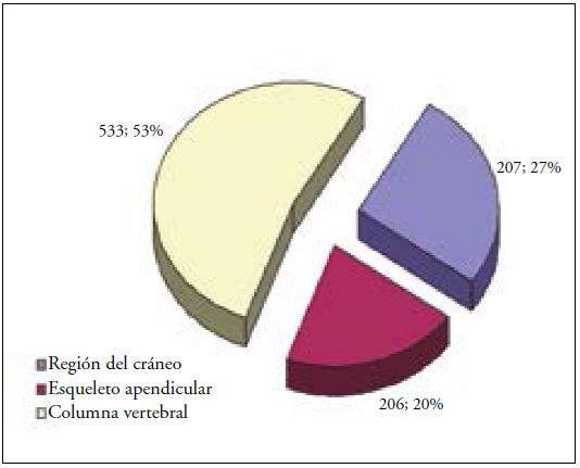 | Columna vertebral | CV | 4 (3.70%) | Apófisis espinosa | 2 | 533 (52.82%) |
