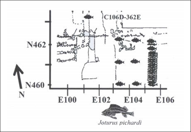 Finalmente, como parte del análisis arqueoictiológico, se llevó a cabo la ubicación de los diversos materiales óseos, en los sectores del sitio de estudio, con el propósito de determinar individuos a partir de las características físicas de los huesos: color, tamaño, textura y alteración tafonómica; la asociación con los diversos materiales arqueológicos: cerámica, lítica, mica, semillas, polen, y otros; y con el argumento final del análisis anatómico y taxonómico, me apoye en los diferentes contextos en que fueron ubicados los materiales culturales: áreas de actividad, entierros, capas, rellenos, pisos, fosas, área ritual, cocinas, entre otros.