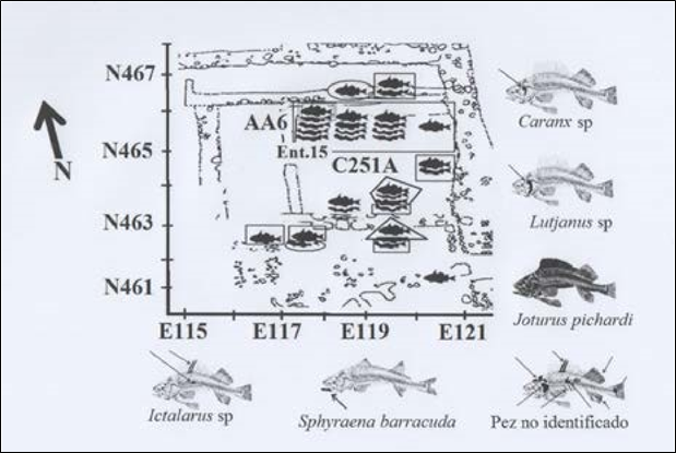 Los huesos identificados, tanto anatómicamente como taxonómicamente, corresponden a seis familias: Atherinidae, Carangidae, Clupeidae, Cyprinodontidae, Lutjanidae y Pomacanthidae; siete géneros: Lile, Ictalarus, Centropomus, Caranx, Lutjanus, Diapterus y Eucinostomus; mientras que en el rubro de especie también fueron siete: Carcharhinus leucas (tiburón toro); Bairdiella ronchus (ronco), Caranx hippos (jurel), Epinephelus nigritus (mero o negrillo), Joturus pichardi (bobo), Mycteroperca bonaci (perca) y Sphyraena barracuda (barracuda). Así el mni, por fase cronológica, fue: ver Cuadro 3.