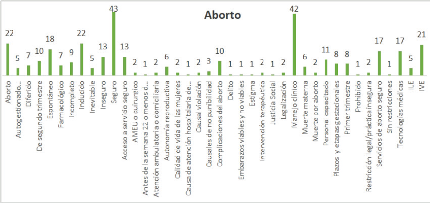 Actualmente, y pese a los cambios, se puede observar dentro del PAE y el LTAS diferentes formas a través de las cuales se habla de aborto, que están en concordancia con los cambios impulsados por el movimiento feminista. La figura 1 muestra por lo menos 40 formas diferentes para hablar de aborto, 10 de las cuales se relacionan con terminología legal y 28 con la biomédica, donde "delito" y "muerte" ya son menos nombrados.