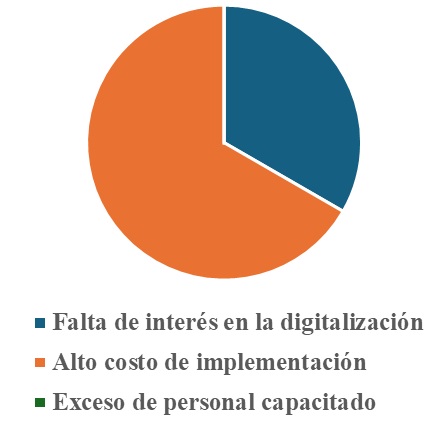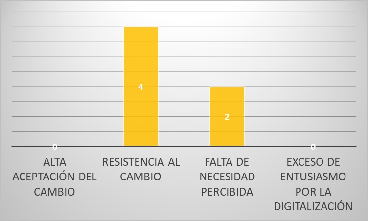 La respuesta mayoritaria indica que la resistencia al cambio es la principal barrera cultural. Esto quiere decir que muchos miembros de las cooperativas pueden estar familiarizados con métodos tradicionales y tienen dificultad para adaptarse a la nueva era digital, esta resistencia puede estar basada en que quizá tienen miedo a enfrentarse a algo nuevo, así también como la falta de habilidades digitales o el temor a que la digitalización puede reemplazarlos.