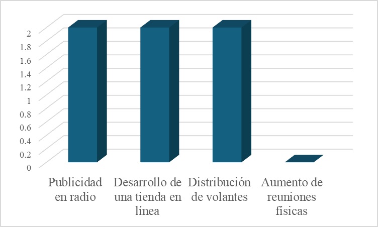 Los resultados arrojan una división equitativa entre la publicidad en radio, desarrollo de una tienda en línea y distribución de volantes lo que significa que las cooperativas han encontrado valor en diversas estrategias digitales. Esto indica que no hay una única solución que funcione para todas las cooperativas y que diferentes estrategias pueden ser efectivas dependiendo del contexto y las necesidades específicas, la distribución de volantes y la publicidad en radio a pesar de ser una estrategia más tradicional, sigue siendo relevante y efectiva para algunos miembros, posiblemente debido a su amplio alcance y capacidad de llegar a una audiencia local especifica, y es algo que en la región de la costa chica en Guerrero sigue sonando, la adopción de una tienda en línea puede mejorar la accesibilidad y la conveniencia para las cooperativas.
