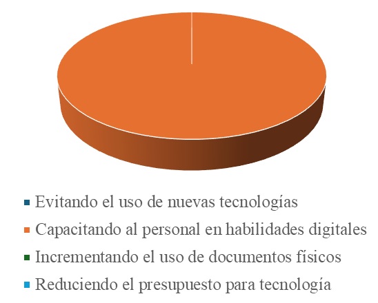 El 100% de los miembros de las cooperativas optó por la opción de capacitar al personal en habilidades digitales, esto indica que se tiene claro el concepto entre los miembros sobre la importancia de empoderar a los empleados con las competencias necesarias para adaptarse y utilizar eficazmente las tecnologías nuevas.