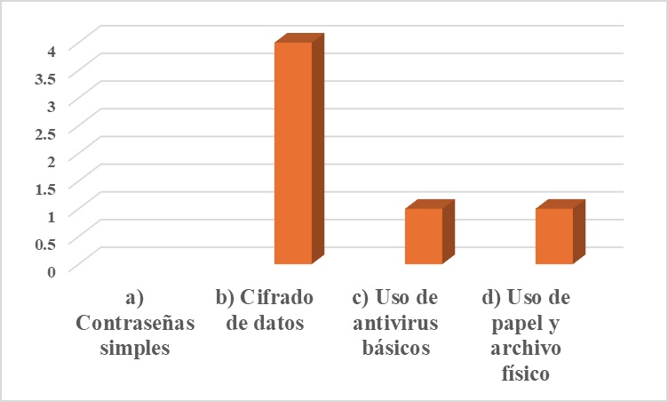 El cifrado de datos es la medida de seguridad digital más comúnmente implementada en las cooperativas, ya que esta opción es la que recibió la puntuación más alta, esto sugiere que las cooperativas están tomando medidas para proteger la confidencialidad e la integridad de sus datos, lo que es una práctica estándar en seguridad informática.