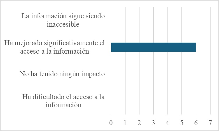 Los resultados indican que la digitalización ha mejorado notablemente el acceso a la información, ya que el 100% de los encuestados coincidieron, esto nos lleva a una percepción claramente positiva del efecto de la digitalización en la accesibilidad de información y así llegar a la toma de decisiones, no hay percepciones de impacto negativo o neutral, entonces concluimos que la digitalización si está trayendo consigo una serie de buenos resultados y sobre todo ha estado facilitando las operaciones diarias, herramientas como análisis de datos y plataformas en la nube ayudan a las organizaciones a tomar decisiones más informadas y a segmentar mejor a sus usuarios, adaptándose a un mercado cada vez más digital (Pereyra, 2024).