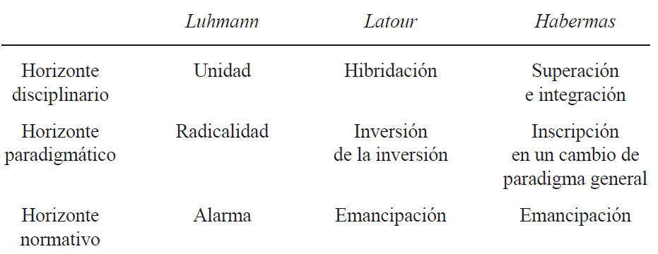 Las coincidencias de Luhmann, Latour y Habermas en los diversos aspectos del triángulo sugieren la existencia de convergencias, aunque no deben dejar de señalarse al mismo tiempo las divergencias que hay entre ellos. Para analizar tanto unas como otras es necesaria una comparación de sus programas. Esa comparación, sin embargo, es obturada por las recepciones recíprocas y los estándares sistemáticos, según los cuales estos programas serían contradictorios, o incluso inconmensurables. Por consiguiente, a pesar de la amplia bibliografía de y sobre los autores y sus controversias, la determinación de divergencias y convergencias entre ellos en materia de innovaciones teóricas y programáticas es un área de vacancia. Nuestra investigación asumió esa falta y sobre ella decidimos problematizar desde una perspectiva sistemática.
