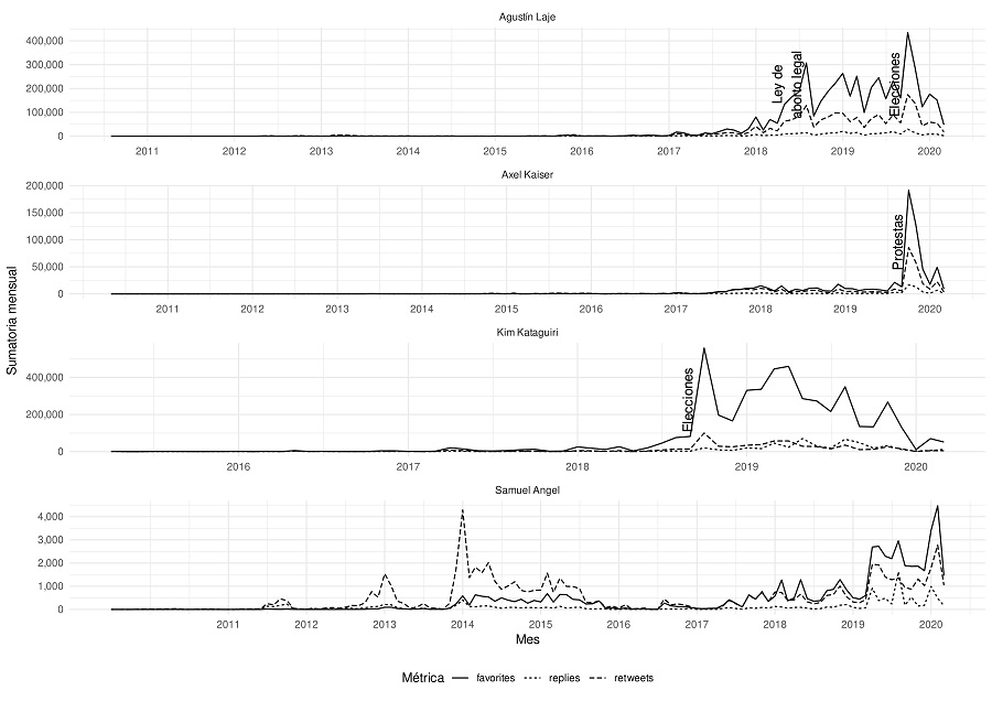 Corpus 1. Accedimos a los estatus primarios4 de los cuatro influencers. Este proceso se inició en 2018 y su resultado es una base de datos con 37 187 textos cortos, cada uno asociado a metadatos relevantes como el autor, la fecha y la cantidad de favs, replies y comentarios.
