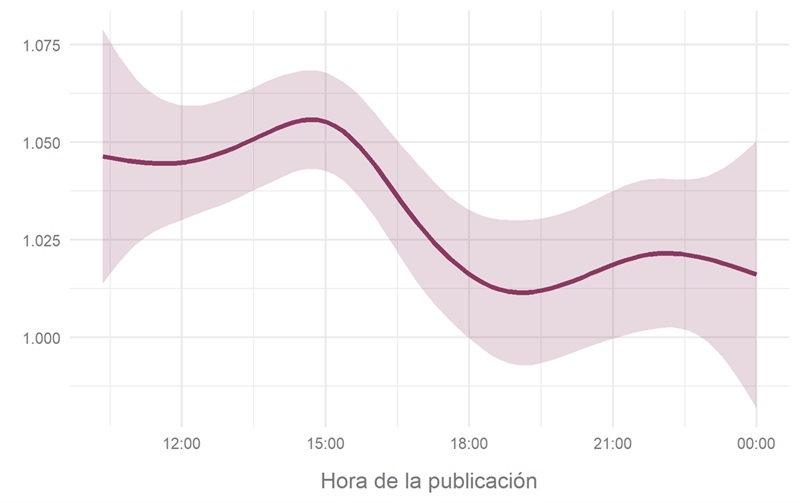 Al 30 de junio de 2019, las cuentas analizadas tenían en promedio seis años desde su activación, con rangos que oscilaban a la fecha entre 0.05 años (es decir, unos pocos días de actividad) y 11.8 años. En promedio, cada cuenta realizó tres publicaciones en el día, con un máximo de 68 publicaciones (cuadro 1). El 82% de los usuarios realizaron de una a tres publicaciones durante el periodo analizado.