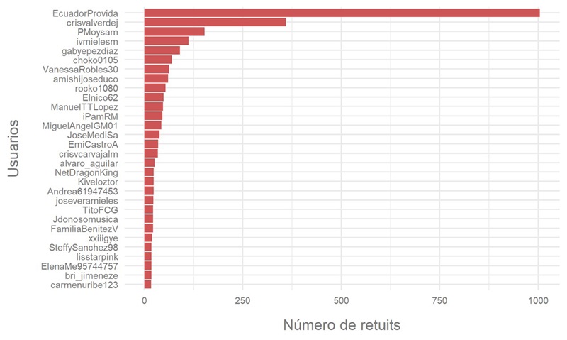 En el gráfico 3 se observan las treinta primeras cuentas cuyas publicaciones, en total, fueron compartidas (retuiteadas) el mayor número de veces. La cuenta con mayor número de retuits fue @EcuadorProvida. Esta cuenta, al mismo tiempo, se encuentra en el cuarto lugar de las cuentas con mayor número de publicaciones efectuadas el 12 de junio de 2019 (gráfico 2). Como uno de los actores digitales más activos del proceso de politización religiosa, se define en su perfil biográfico de Twitter como un grupo de “Ecuatorianos que amamos y defendemos la vida desde la concepción hasta la muerte natural. ¡Viva la vida!” Esta cuenta se unió a la red social en mayo de 2012, siete años antes del evento analizado. Para julio de 2021 tenía un total de 12 581 seguidores.