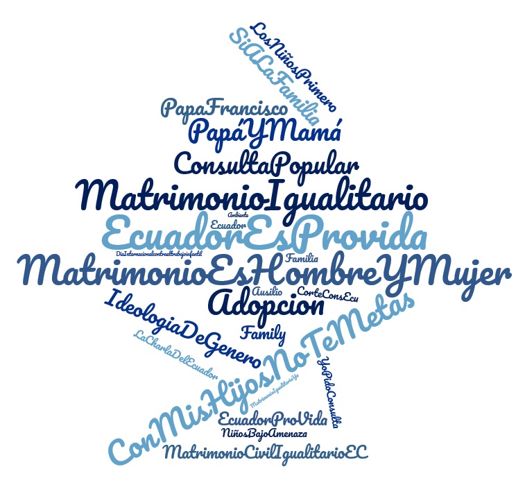 Una forma de rastrear los núcleos de sentido que condensan las posiciones de estos actores es prestar atención a las etiquetas y a las palabras que se usan en las publicaciones de Twitter en conjunto con el hashtag #FamiliaBajoAmenaza. En la figura 1 y en el cuadro 2, por ejemplo, apreciamos que la etiqueta que aparece con mayor frecuencia es #EcuadorEsProvida, seguida de #MatrimonioEsHombreYMujer, #MatrimonioIgualitario, #Adopción y #ConMisHijosNoTeMetas. Algunos de los hashtags que siguen en la lista mantienen consonancia con los cinco primeros: #PapaYMama, #SiALaFamilia, #Family, #Familia, #LosNiñosPrimero.