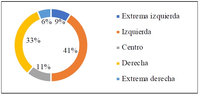 En una investigación como la presente cobra relevancia la consciencia política del individuo. La consciencia política es un estado en el que el sujeto se percata de la manera en que percibe el mundo, lo que le motiva a tomar decisiones relacionadas con la identidad y la cultura en un contexto social y lugar determinados (Jameson, 1991, pp. 438-444); son los lazos que conectan al individuo con un grupo de intereses y objetivos compartidos, los cuales pueden presentarse en términos de identidad territorial, socioeconómica, cultural o religiosa (Rulska-Kuthy, 2014). Con estos fundamentos, la figura 1 muestra la distribución porcentual a partir de la autoidentificación ideológica de los participantes.