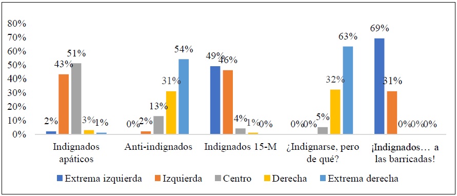 | Anti-indignados | 24.5% | Escasos | Muy escasos | Amplios | Nula | Reconocen el malestar, pero consideran que los movimientos sociales generan más perjuicios que beneficios. Son reacios. Sólo cuando haya una amplia masa crítica se sumarán. |