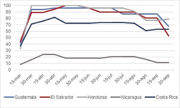 Tal como se muestra en el gráfico 1, las medidas restrictivas y de cierres de lugares fueron aumentando en los primeros meses de la pandemia, a partir de los primeros reportes de casos por covid-19 en los países estudiados, hasta llegar a niveles cercanos al 100; con la excepción de Nicaragua que se mantuvo por debajo de 25 en todos los meses analizados. Para septiembre de 2020, tanto Guatemala como El Salvador empezaron a mostrar un relajamiento de las medidas, luego de haberse mantenido durante cinco meses con restricciones continuas. En los casos de Honduras y Costa Rica se reportó una disminución de los niveles de exigencia de las políticas a partir de agosto, que continuó en los siguientes días.