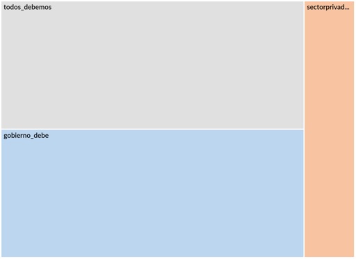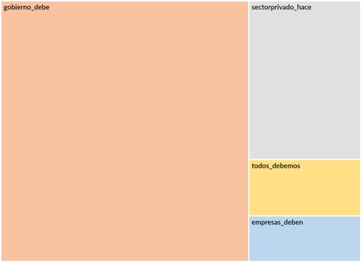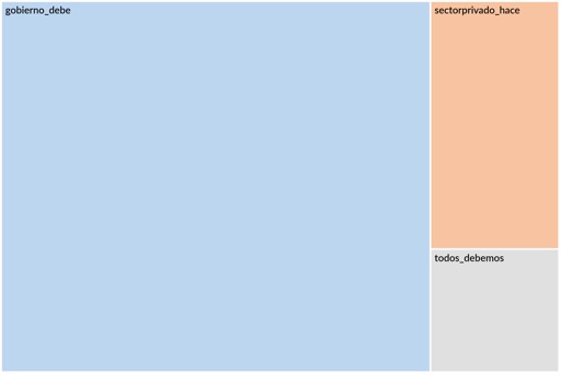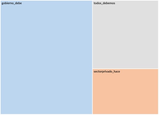 Asimismo, los discursos de las élites guatemaltecas pusieron énfasis en el deber ser del gobierno y la sociedad (véase gráfico 2). Así, en las publicaciones, muchas veces acompañadas del hashtag #EnEstoEstamosTodos, se reiteró la necesidad de que se asumiera una actitud constructiva y de solidaridad dentro del país, bajo la consigna: “¡Depende de todos!”. Al hablar de una responsabilidad de todos, las élites económicas buscaron bajarle el tono a quienes desde diversos sectores demandaban reformas fiscales que gravaran los ingresos de los sectores más ricos. Además, cuando las élites hablaron de sus pares se procuró publicitar las labores de filantropía corporativa, en particular a las donaciones de alimentos, equipo médico y dinero para la atención de la emergencia; bajo el hashtag #TrabajamosPorTi Guatemala, el CACIF ha sido un actor político dominante en la gestión pública y cuya activa participación política ha logrado limitar históricamente cambios institucionales de los partidos políticos (Sánchez, 2008). A lo largo de su historia, como cámara, CACIF ha sabido articular no solamente intereses económicos alrededor de su órbita, sino sobre todo expertise, conocimiento e información.