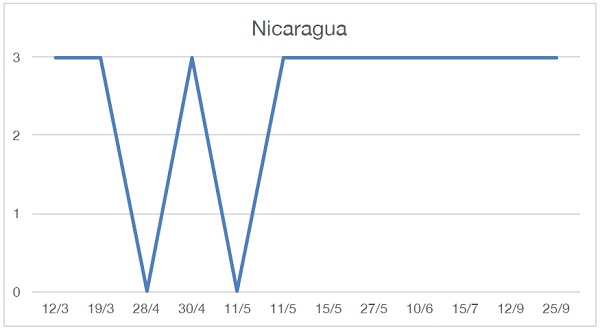 En Nicaragua, por otra parte, el COSEP de manera reiterada se refirió a la necesidad de que el gobierno tomara medidas restrictivas para la contención de la propagación del virus en el primer trimestre. Lo anterior ante la inacción de las autoridades nicaragüenses y la escasa severidad de sus estrategias para contener el virus, como se visualiza en el gráfico 1. A partir de esta situación, el COSEP en los meses siguientes se dedicó a presentar sus propias propuestas y solicitudes al sector empresarial y la comunidad en general a fin de ejercer una responsabilidad colectiva en torno a la contención y prevención del covid-19.