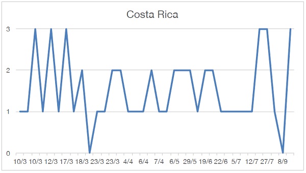 En el caso de Costa Rica, se pueden observar niveles de tensiones variables que no muestran una consistencia estable, y es el segundo país que presenta más tensiones discursivas: del total de publicaciones analizadas, un 25% se ubica en el nivel 3 de nuestra escala, un 23% en nivel 2, y un 48% en nivel 1 (gráfico 7). Como se apuntó, la gestión de la pandemia fue compartida con el sector privado, por lo que los niveles de tensión aquí observados parecieran obedecer a presiones de las élites económicas por nivelar a su favor el proceso de cogestión de las políticas de atención a la crisis.