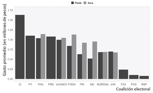 Los candidatos ganadores tuvieron un gasto promedio de 823 393.20 pesos, mientras que los candidatos que perdieron gastaron, en promedio, 487 404.60 pesos. Esto implica una diferencia de 335 988.60 pesos respecto al gasto entre ganadores y perdedores. Este hallazgo es relevante y podría interpretarse de dos formas: 1) que los candidatos tienen una probabilidad más alta de ganar y es que más gastan son aquellos que tienen mayores ahí donde invierten más recursos. En el gráfico 3 posibilidades de ganar, o 2) que las coaliciones se ven las diferencias en el gasto entre ganadores electorales saben cuáles son los distritos donde y perdedores por coalición electoral.