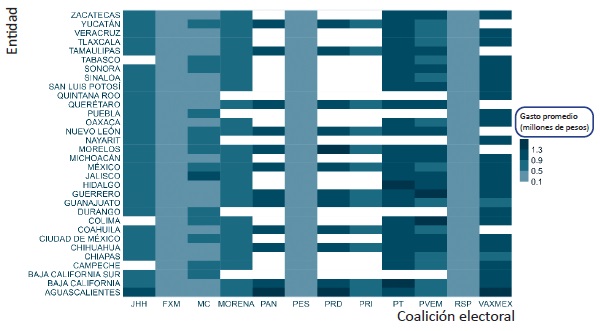 Ahora bien, el gasto promedio de los candidatos por coalición electoral tampoco fue constante a lo largo de las entidades federativas. En el gráfico 5 se presenta un mapa de calor en el que se observa la variación en términos del gasto promedio de los candidatos para las 32 entidades federativas. Los espacios en blanco significan que no hubo un candidato de coalición en esa entidad, o bien que un partido político participó en la coalición, pero no registró al candidato. En este sentido, se advierte que la coalición Juntos Hacemos Historia no presentó un candidato común en Campeche, Colima y Tabasco. Por su parte, Va por México no fue unida en Coahuila, Morelos, Nuevo León, Querétaro, Tamaulipas ni Yucatán. En cuanto a los colores, mientras mayor intensidad tiene el azul del mapa, los candidatos de una coalición o partido gastaron más recursos. Por ejemplo, los candidatos de Juntos Hacemos Historia gastaron más en Aguascalientes en promedio (908 710.10 pesos), en comparación con el resto de las entidades, situación similar a la de Va por México, ya que sus candidatos tuvieron mayor gasto promedio (1 315 537.60 pesos) en la misma entidad. En contraste, los candidatos de la coalición Juntos Hacemos Historia gastaron menos en promedio en Veracruz (514 196.00 pesos), mientras que los de Va por México tuvieron su menor gasto promedio en Guanajuato (865 235.50 pesos).