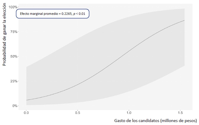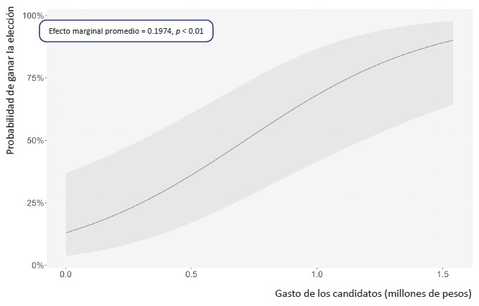 Resalta que el coeficiente de la variable del gasto de los candidatos tiene un efecto positivo y estadísticamente significativo en la probabilidad de ganar una elección en los cuatro modelos principales. Este efecto es sumamente consistente en las cuatro especificaciones. En todos los casos el coeficiente resultó estadísticamente significativo al 1%. Esto implica que la cantidad de dinero erogada en las campañas de 2021 sí tuvo un efecto relevante en la probabilidad de que un candidato resultara ganador al buscar un escaño en la Cámara de Diputados.