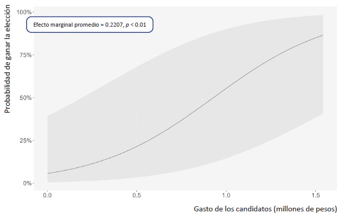 Los resultados indican que el gasto en las candidaturas tiene un efecto estadísticamente significativo en la probabilidad de ganar una elección legislativa, además de que los candidatos que buscan reelegirse también aumentan sus probabilidades de ganar. No obstante, cuando se aplican modelos que incluyen la fuerza electoral de los partidos políticos en la elección inmediata anterior, el resultado ya no es significativo. Al recurrir a diversos modelos de regresión logística binomial, se ofrecen diferentes efectos marginales promedio. Cada uno se describe de manera individual para explicar los casos en los que el dinero influye más en las probabilidades de ganar una elección para un puesto legislativo.