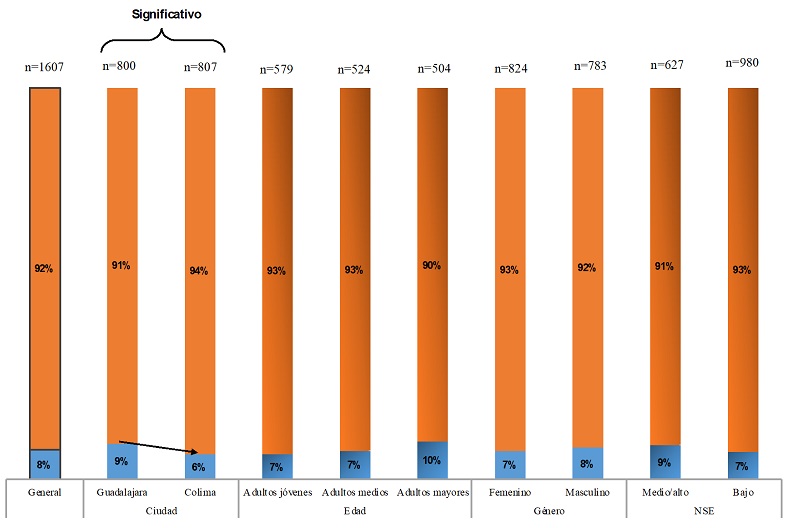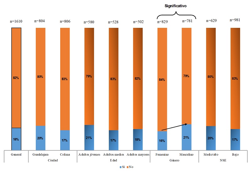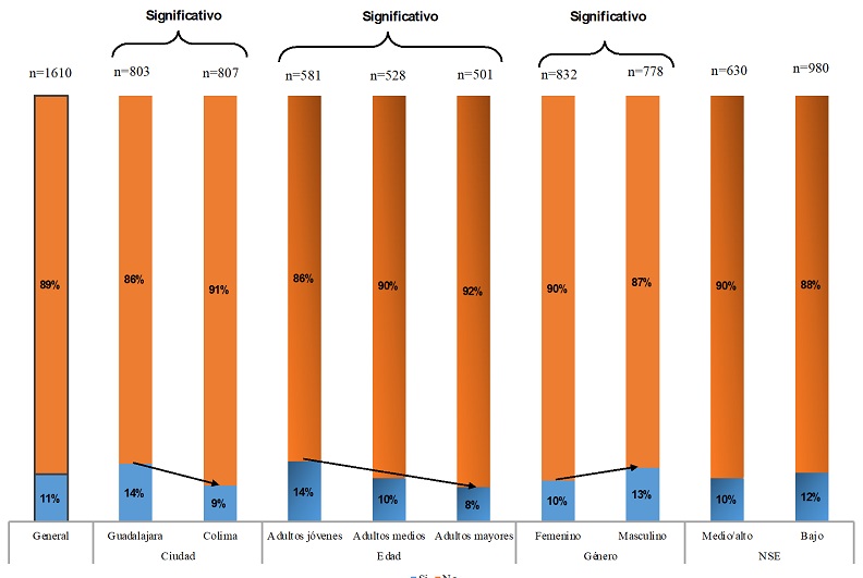 En el caso de la búsqueda de una aventura sexual en el último año la encuesta nos reporta un 11% de interesados/as en promedio, más frecuente en la ciudad de Guadalajara, 14% más que en Colima, 9%; más entre los adultos jóvenes que en los medios y los mayores, 14% frente a 10% y 8%, respectivamente; más entre los hombres que entre las mujeres, 13% frente a 10%, y más en el nivel bajo que en el medio/ alto, 12% frente a 10%.