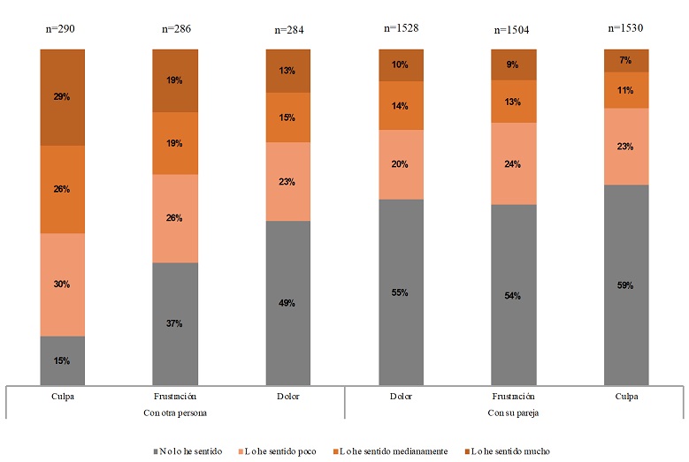 Dentro de las emociones negativas tenemos que todas se experimentan en meyor medida dentro de las relaciones sexuales con personas que no son la pareja. Como se mencionó anteriormente, la más acusada es la culpa venida seguramente del sentimiento de transgresión que implica violar las normas de la fidelidad y la monogamia que rigen en la cultura hegemónica. En el caso de las emociones negativas, las opciones de “lo he sentido mucho” y “lo he sentido medianamente” resultan, para las relaciones extraconyugales, la culpa con un 55%, la frustración con un 38% y el dolor con un 28%. Por lo que respecta a las relaciones con la pareja, el dolor encabeza la lista con 24%, le sigue la frustración con 22% y la culpa con 18%.