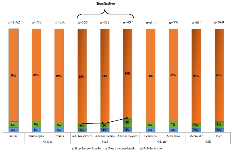 En las preguntas dirigidas a la situación en las que las personas respondientes fueron perdonadas o no, tenemos que al tratarse de aventuras ocasionales el promedio es 10%, en donde Guadalajara es más tolerante que Colima, 11% frente a 8%. Adultos mayores y jóvenes reportan un 11%, mientras que los medios un 8%, y resalta que los mayores no han perdonado a su pareja el doble que los jóvenes, 10% frente a 5%. En términos genéricos, los hombres han sido perdonados en mayor medida que las mujeres, 11% frente a 9%; en consonancia con lo reportado en la pregunta sobre si el respondiente había perdonado a su pareja por una aventura sexual ocasional, resultó que 15% de las mujeres lo había hecho frente a un 11% de los hombres. En cuanto al NSE, el nivel medio/alto lo hace más que el bajo, 11% frente a 9%; al tiempo que el bajo no ha perdonado en un 9% frente al medio/alto en un 5%. Pasemos ahora a observar el dato de haber sido perdonado por tener relaciones paralelas señalado en el gráfico 14.