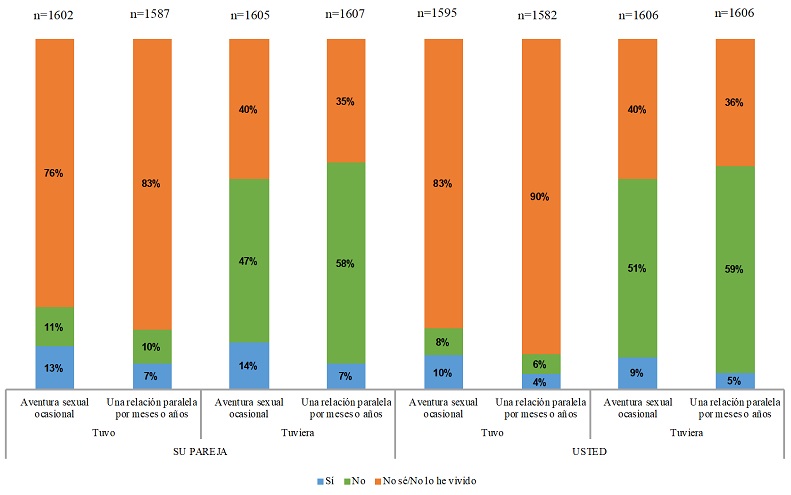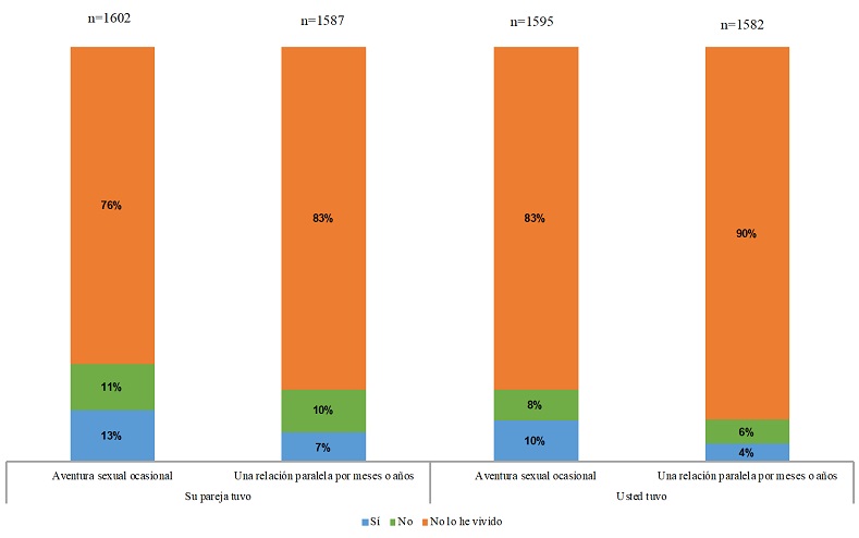 El primer aspecto que trataré es el de la ocurrencia de relaciones extraconyugales. Sobre este tema, en las entrevistas realizadas en la fase cualitativa aparece como una práctica bastante generalizada, sobre todo entre los hombres de las tres generaciones trabajadas, aunque también apareció en los relatos femeninos (Rodríguez, 2022b; Rodríguez, 2022). En la EIRP se preguntó en términos generales si la persona había tenido relaciones sexuales con otra persona adicional a su pareja. El porcentaje de respuesta afirmativa resultó ser bajo, en contraste con lo antes dicho.