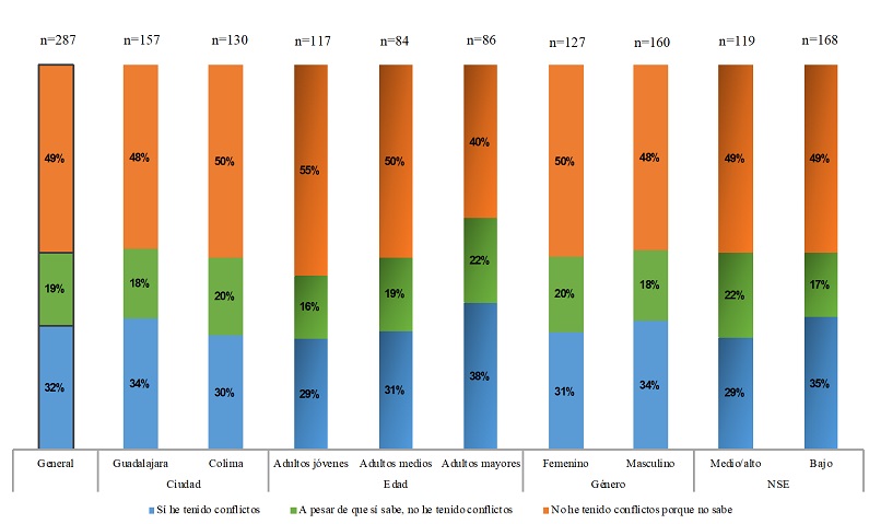 En cuanto a la diferencia entre ciudades, en Guadalajara hay menor tolerancia a las relaciones extraconyugales, pues haber tenido conflictos aparece 4 puntos por arriba de Colima, y también es 2 puntos menor la opción de no tener conflictos, a pesar de saberlo. La comparación entre generaciones resulta muy significativa. El nivel de conflictividad es mucho mayor entre los adultos mayores, mientras que entre los medios y jóvenes se asemejan. No obstante, entre los mayores es más frecuente haber sido descubiertos sin tener conflictos, 6 puntos más que entre los jóvenes. Esto se relaciona con el hecho de que entre los mayores es 15 puntos menor el porcentaje de que la pareja sí sepa de la conducta extraconyugal. Los adultos jóvenes conservan mucho más el secreto, y un poco menos los adultos medios. Al parecer, la idea de tener una vida autónoma a pesar de estar en pareja es un valor que se hace cada vez más presente.