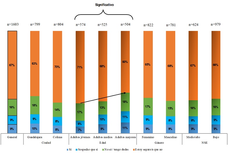En lo que respecta a la relación paralela de la pareja, las opciones de respuesta se amplían a “sospecho que sí” y “no sé, tengo dudas”, además del sí y no. En cuanto a la respuesta afirmativa, los porcentajes se asemejan mucho a las respuestas dadas en la pregunta anterior, cuando el respondiente habla de su propia práctica. Resulta interesante que los porcentajes que se reportan sobre la opción “sospecho que sí” son prácticamente iguales a los de la opción afirmativa. En este sentido, al sumar ambas opciones, tenemos que el 18% sabe o cree, en promedio, que su pareja tiene una relación paralela; más en la ciudad de Guadalajara que en Colima, el 19% frente al 16%; los adultos mayores más que los medios y jóvenes, el 22% frente al 19% y el 13%, y casi en igual proporción mujeres el 18%, que hombres el 17%. Sobre el NSE casi no hay diferencias, el 17% en el medio/alto y el 18% en el bajo.